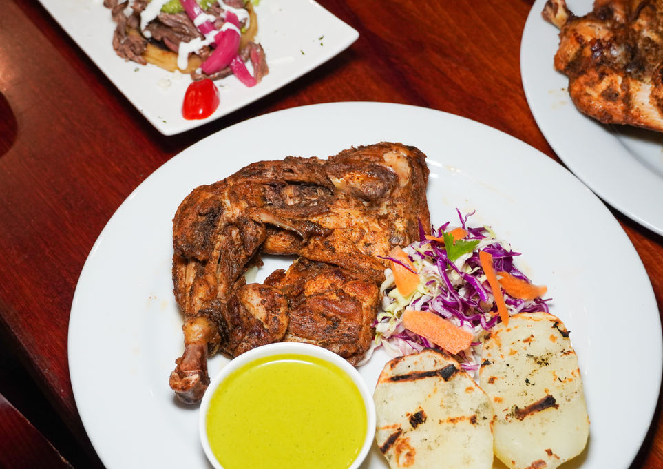 Fried chicken marinated in traditional aji panca sauce; served with grilled potatoes, cabbage salad, and aji rocoto sauce (By Anita Vinces).