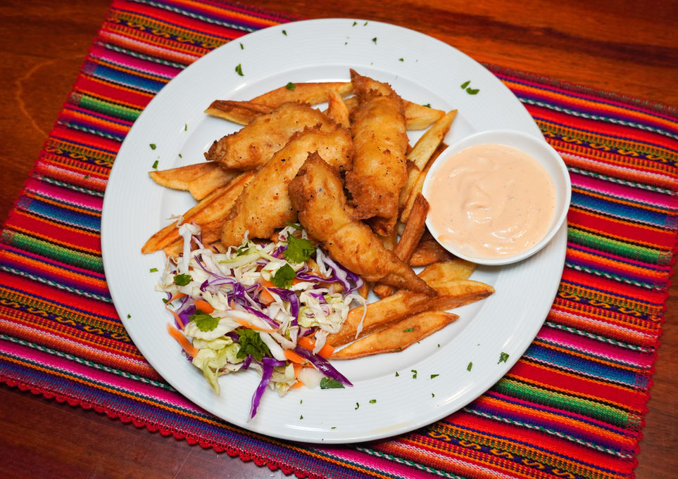 Fried mixed-seafood platter (fish, calamari, shrimp) with yuca frita, salsa criolla & tartar sauce.